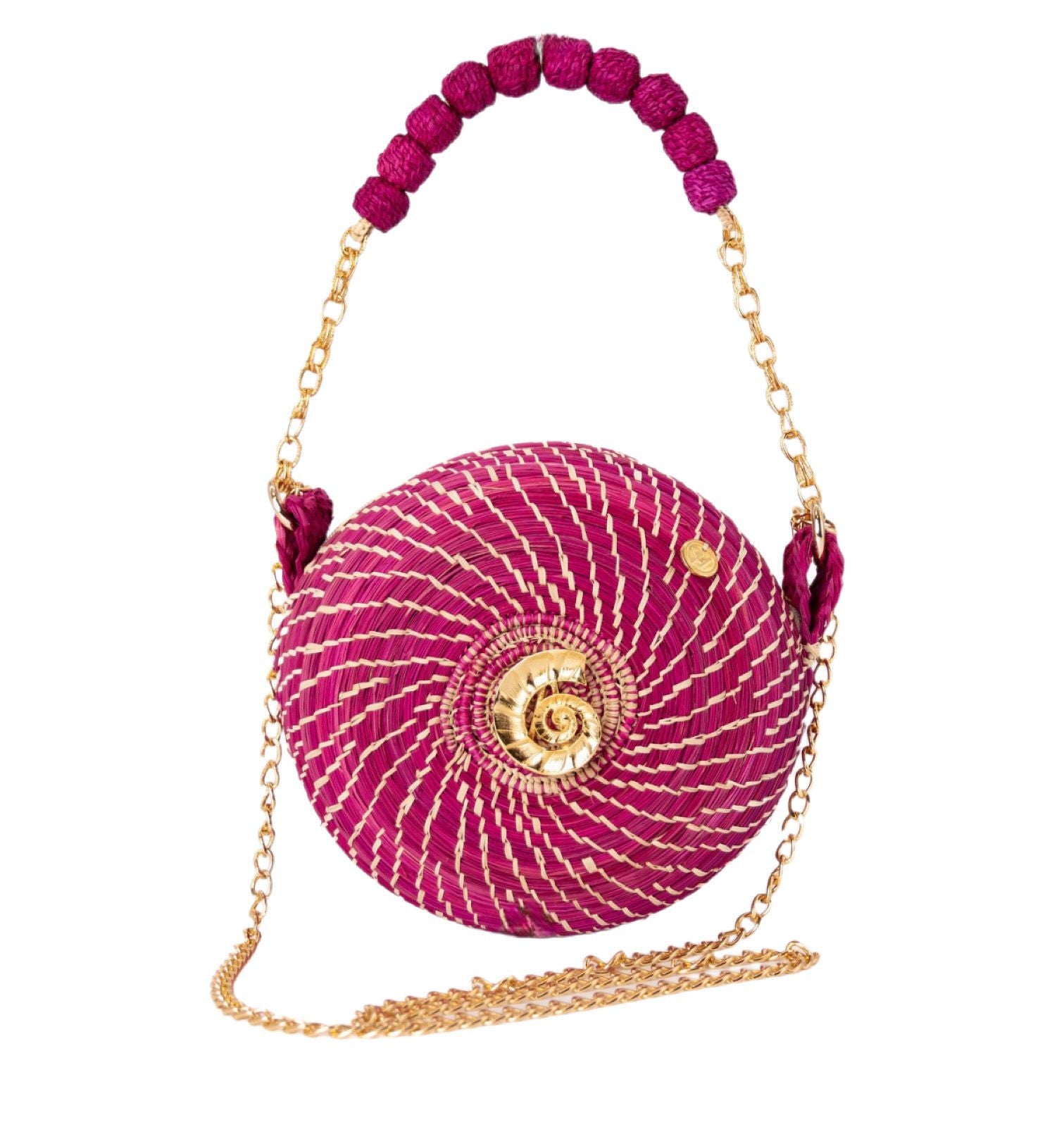 Its sculptural circular shape and striking magenta tone are finished with elegant gold chain details and a spiral centerpiece that nods to the sea’s natural forms. Made in small batches with a low-impact, sustainable approach, this bag is a celebration of slow fashion: fewer resources, more craftsmanship, and meaningful impact. By carrying it, you support fair artisan work, cultural preservation, and a more conscious way to wear luxury.