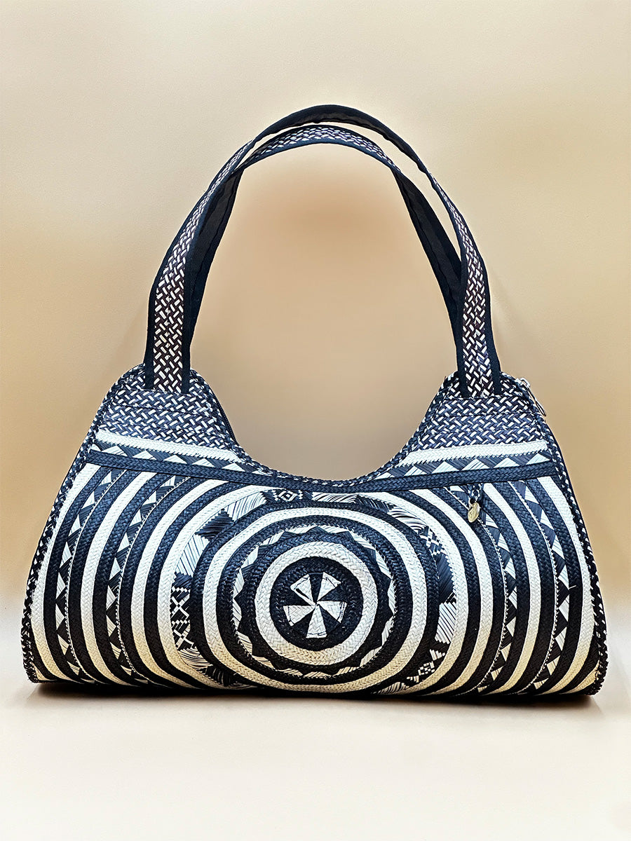 Mandala bag is 100% handwoven by artisan from Colombia. This is un vegan accessories and was handmade with caña flecha. The caña flecha Palm fibers, a resistant thread that comes from tropical palm trees. The thread is sun dried, tinted and hand wove.