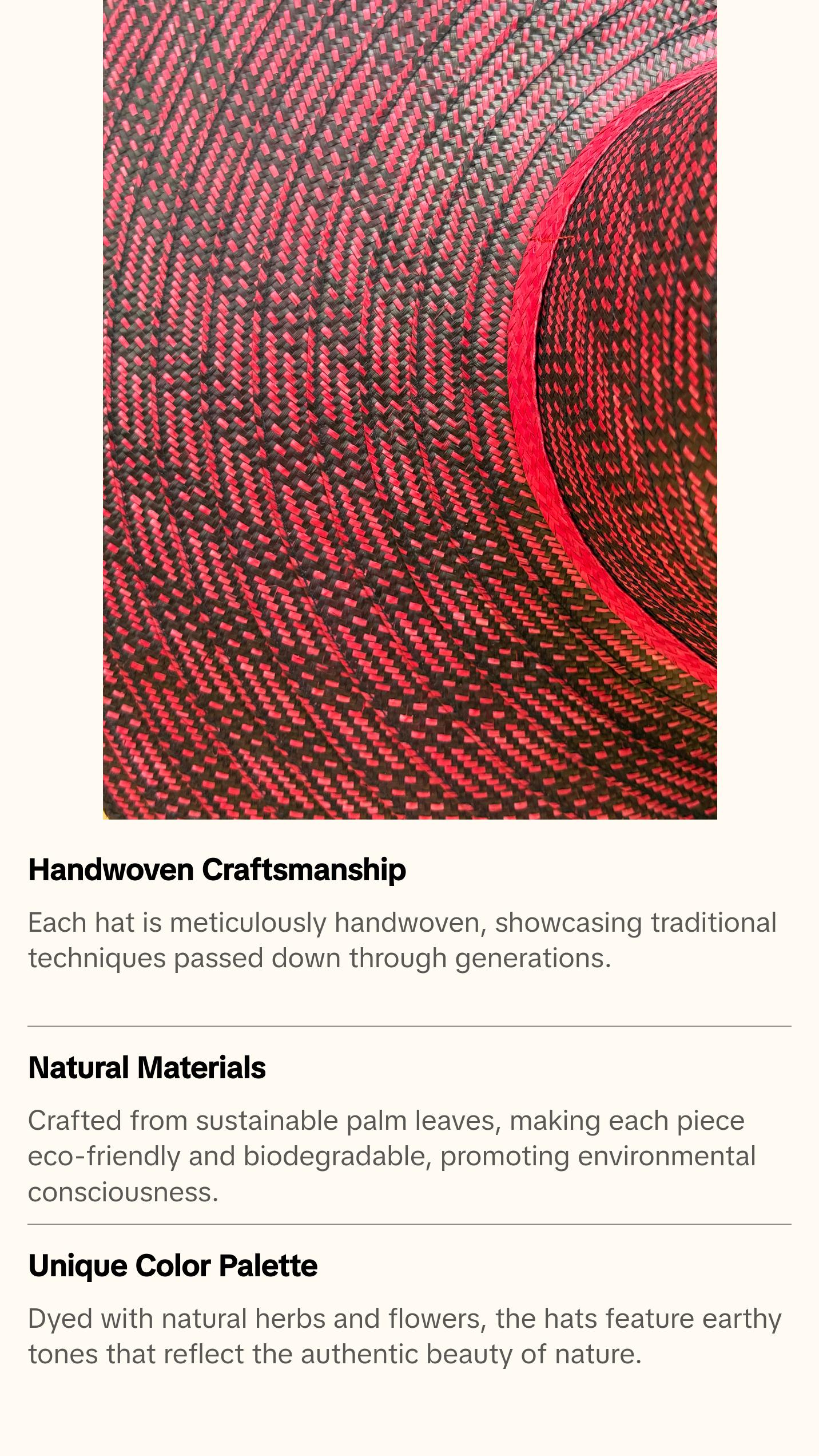 What truly sets these hats apart is their organic color palette. Each hat is dyed with a unique blend of natural herbs and flowers, creating earthy, vibrant tones that reflect the raw beauty of nature. The entire process takes up to a month to complete—ensuring every hat is a one-of-a-kind work of art, as individual as you are.
