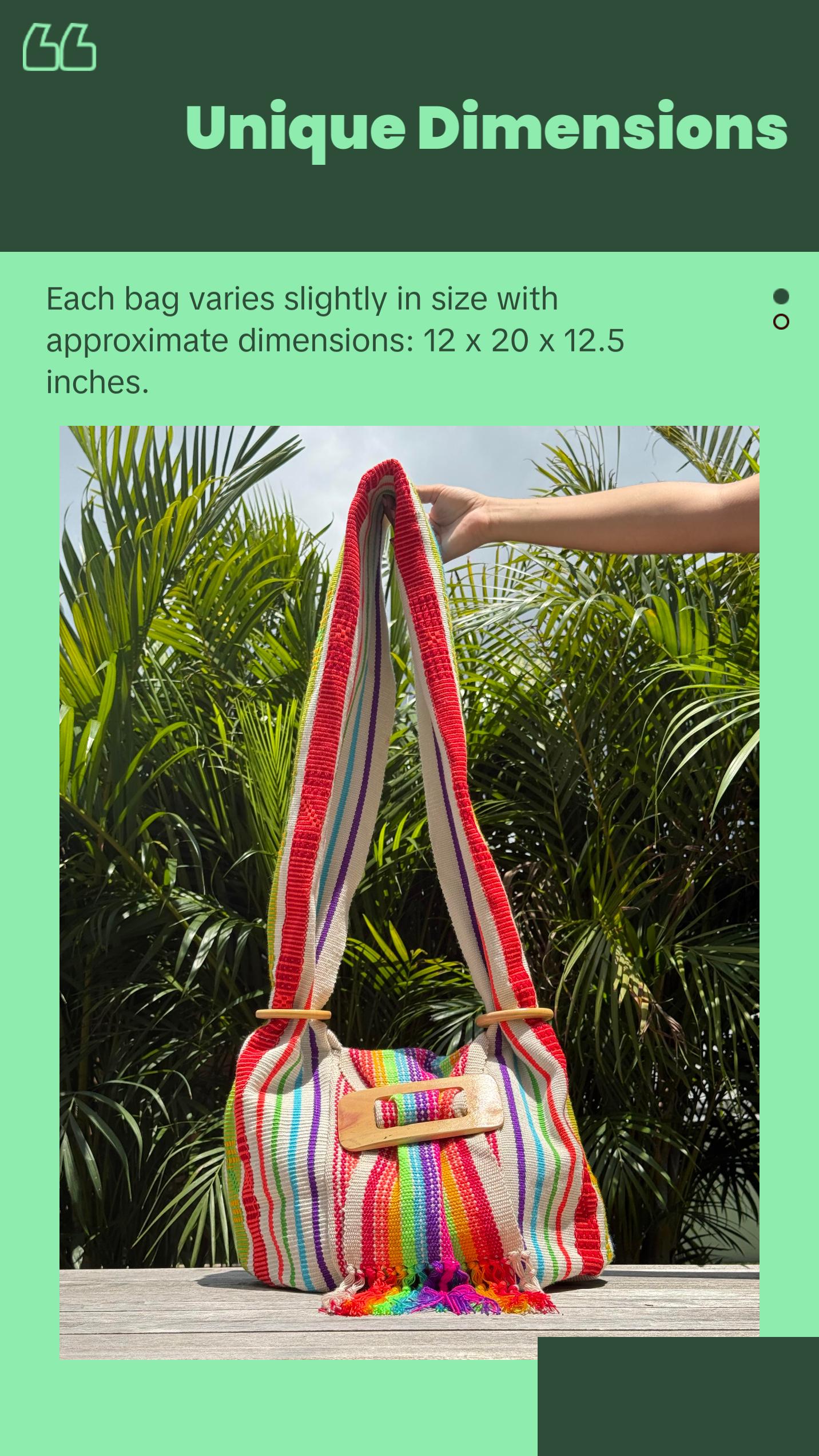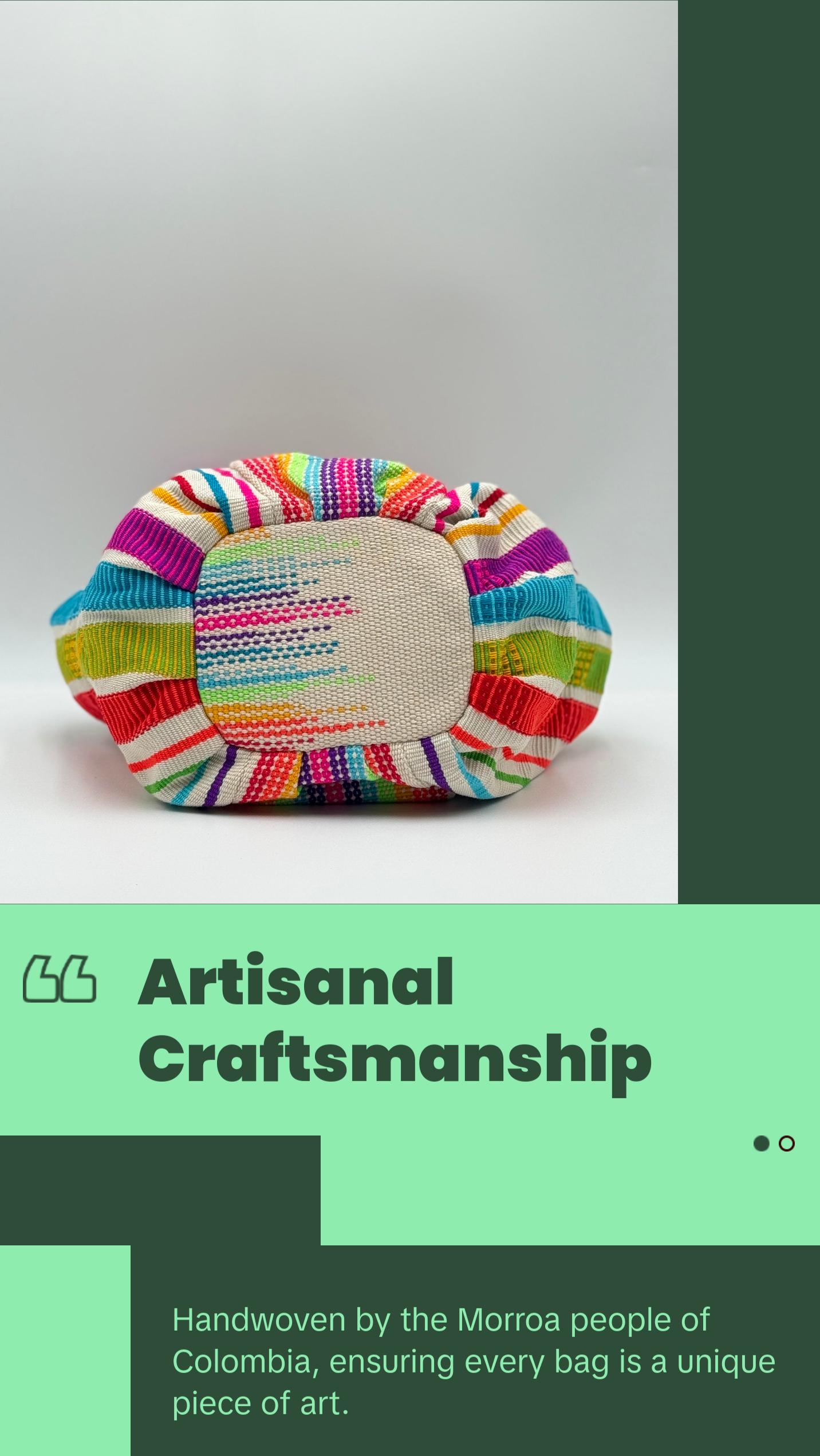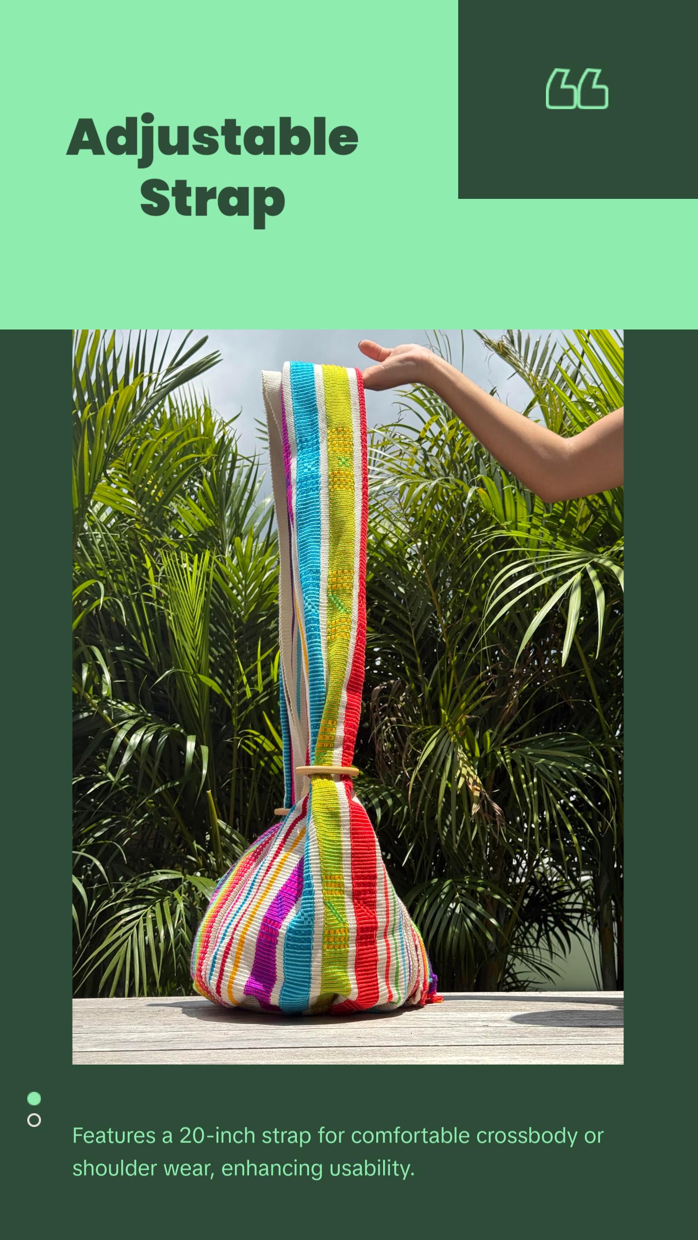 Handwoven by the Morroa people of Colombia, each bag is a unique piece of art crafted with fine cotton threads on traditional looms. 100% handmade and sustainable, these bags combine vibrant cultural heritage with eco-friendly design. No two are alike, making each one a truly special, one-of-a-kind accessory. A perfect blend of artistry, tradition, and sustainability.